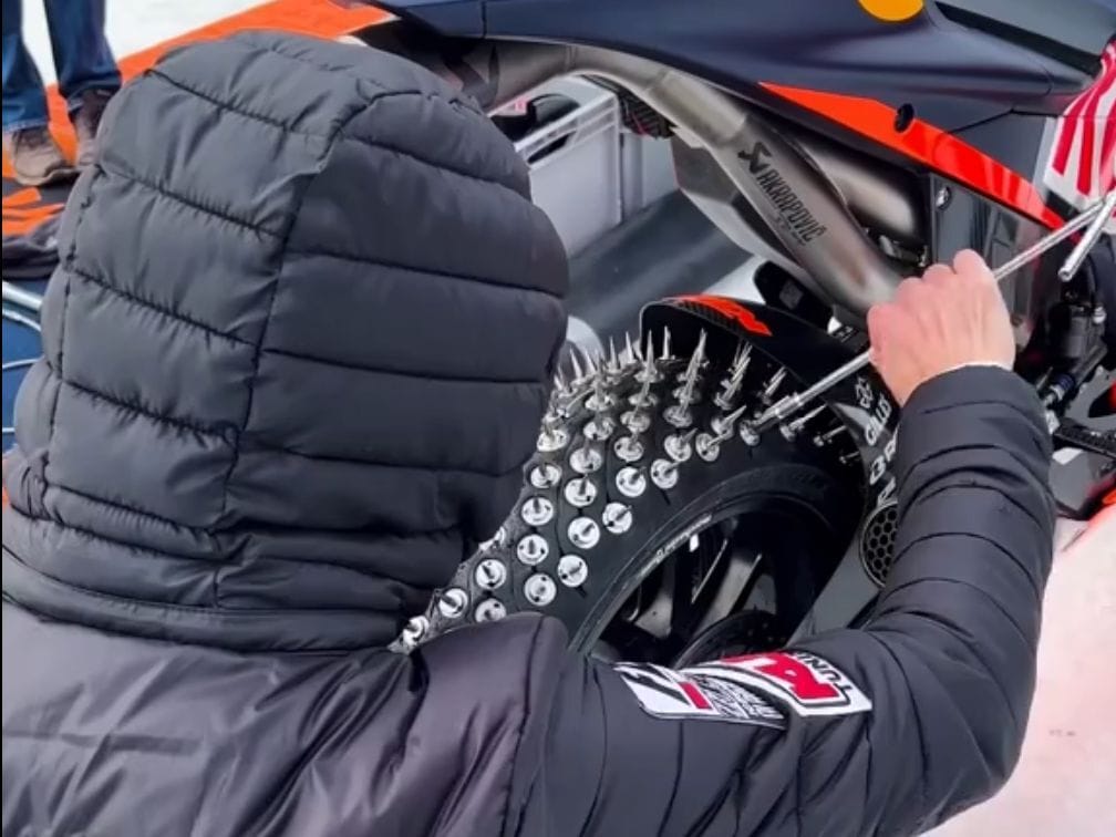 Watch pro biker blast across ice and snow on a motorcycle with custom tires like you've never seen before.